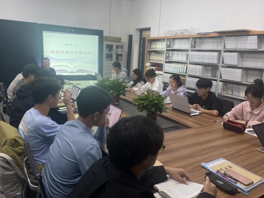 2025年9月27日19:00,历史与旅游文化学院春秋读书会民国史组在南区1号楼1105教室开展了2025年下半年第二次读书活动,此次读书会由上官定一老师带领学生阅读《中华民国史》第二卷下册中的第八章内容。